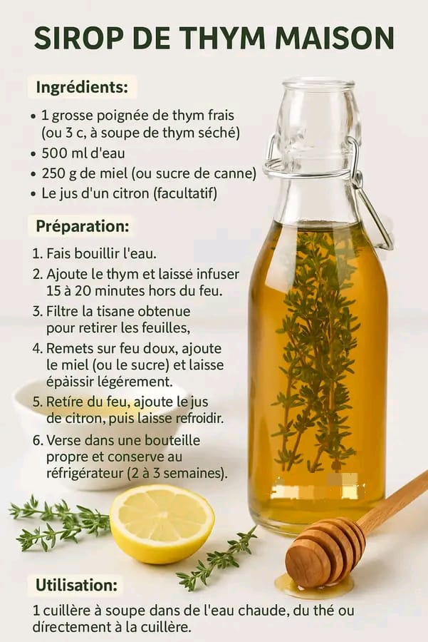🌿 SIROP DE THYM MAISON October 30, 2025 by admin 🧺 Ingrédients : • 1 grosse poignée de thym frais (ou 3 c. à soupe de thym séché) • 500 ml d’eau • 250 g de miel (ou sucre de canne si tu préfères) • Le jus d’un citron (facultatif mais excellent pour la gorge) 👩🏾🍳 Préparation : Suivant » Suivante→