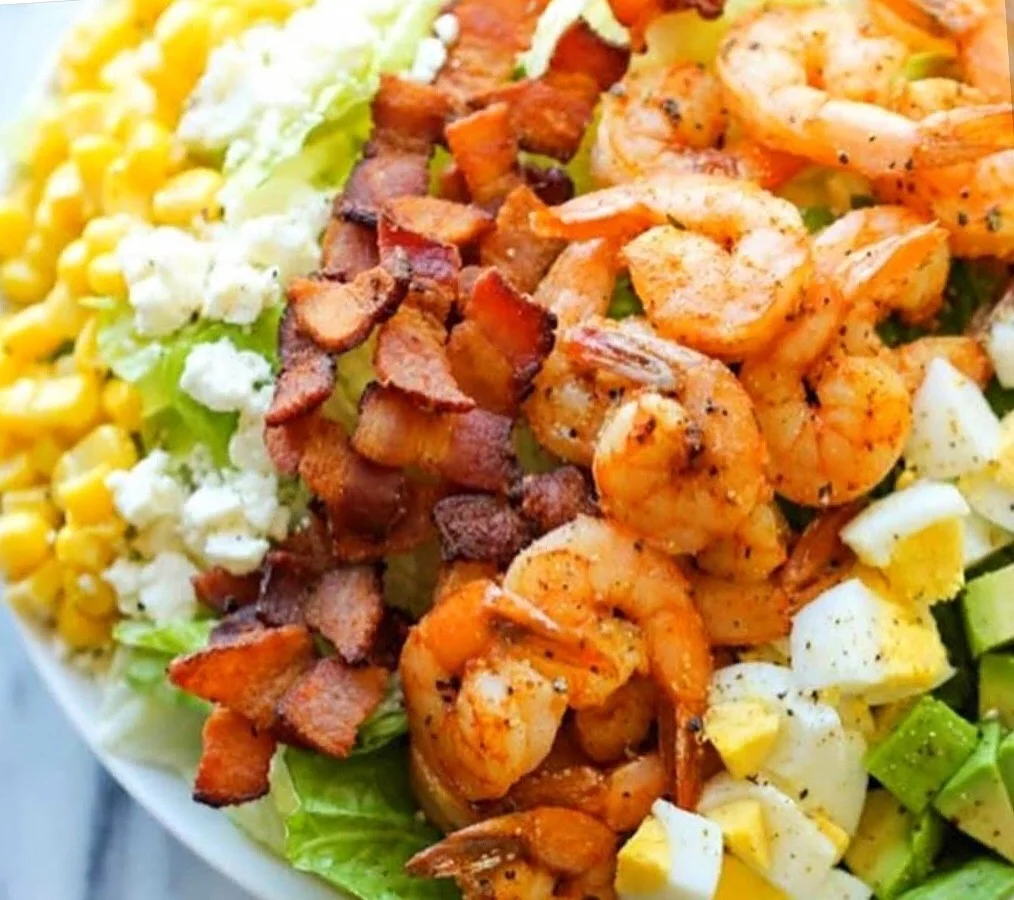 Des crevettes grillées et épicées, du bacon croustillant, des œufs durs, de l’avocat crémeux, du maïs sucré et du fromage de chèvre fondant, le tout sublimé par une vinaigrette maison à la coriandre et au citron vert 🌿🍋.