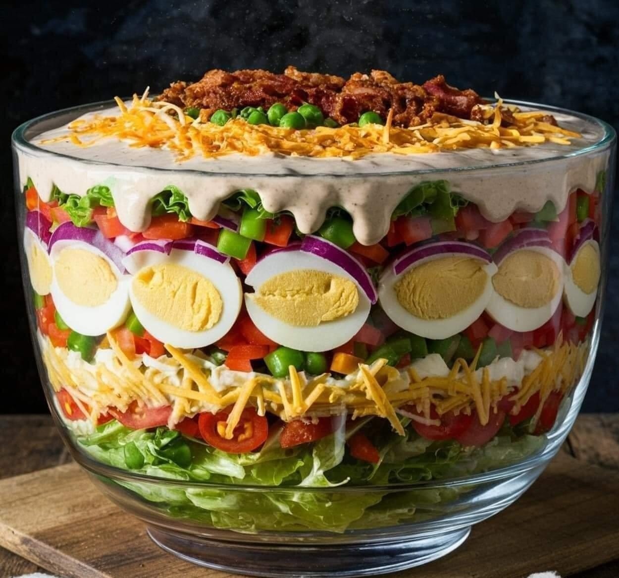 Ingrédients 1 tête de laitue iceberg, hachée 1 tasse de tomates cerises, coupées en deux 1 tasse de concombres, tranchés 1 tasse de petits pois surgelés, décongelés 6 œufs durs, hachés 2 tasses de fromage cheddar râpé 8 tranches de bacon, cuites et émiettées 1 tasse de mayonnaise 1/2 tasse de crème sure 2 cuillères … Read more