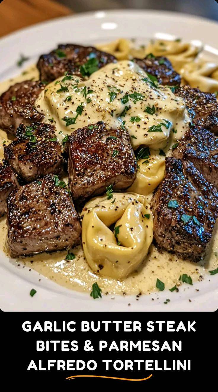 Bouchées de bifteck au beurre à l’ail avec tortellini Alfredo au parmesan
